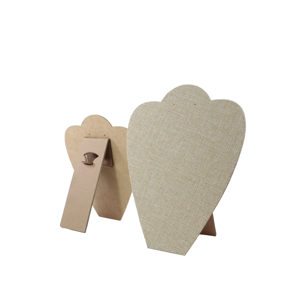 Exhibe tus collares y aretes con un toque romántico y elegante gracias a este hermoso cuello fabricado en MDF y forrado en galant color arena en forma de corazón. Disponible en dos tamaños para adaptarse a tus necesidades de exhibición. Resalta tus joyas con estilo y modernidad: