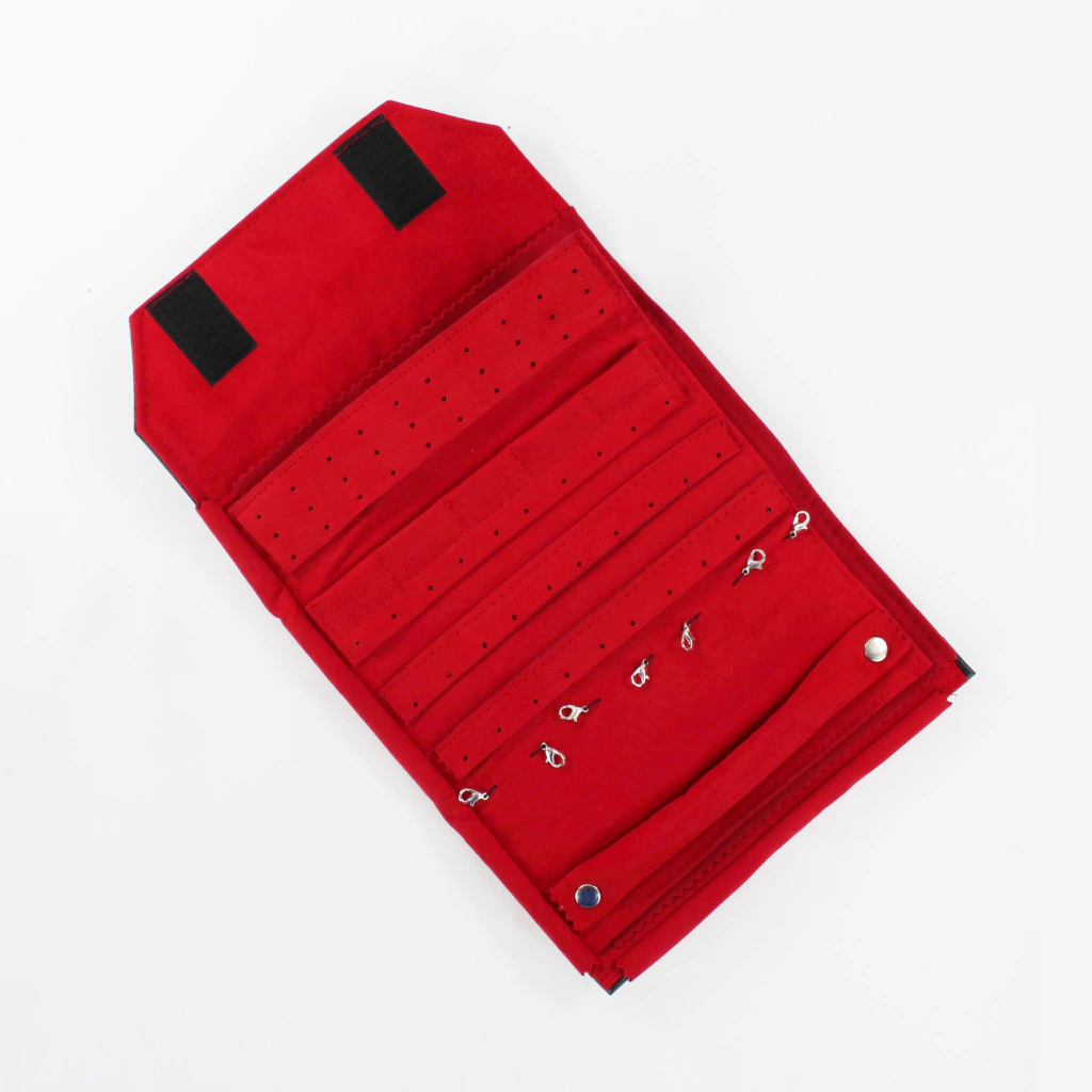 ¡La solución perfecta para llevar tu colección completa a donde quieras! 💍💫 Esta práctica manta mixta está fabricada con un hermoso y elegante vinipiel color negro por fuera y un suave terciopelo interior rojo, ideal para proteger tus piezas favoritas.